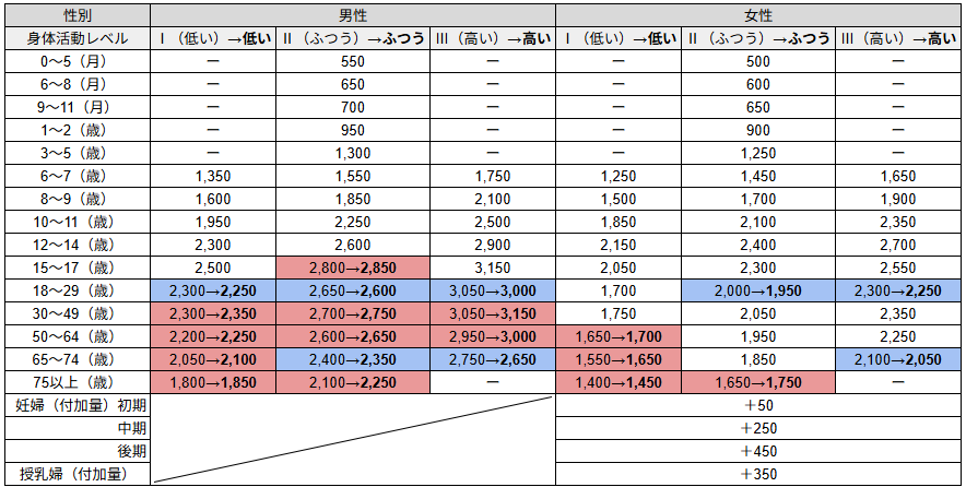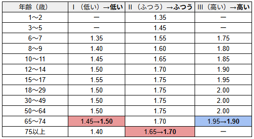 【年齢区分及び身体活動レベル(カテゴリー)別の身体活動レベル基準値(男女共通)】